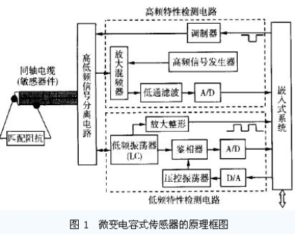 設(shè)計(jì)的微變電容式傳感器的原理框圖如圖1 所示。該傳感器由同軸電纜、高低頻信號(hào)分離電路、高頻特性檢測(cè)電路、低頻特性檢測(cè)電路和嵌入式系統(tǒng)等組成。高頻特性檢測(cè)電路監(jiān)測(cè)同軸電纜特性阻抗的變化, 而低頻特性監(jiān)測(cè)電路則監(jiān)測(cè)同軸電纜分布電容的變化, 兩電路相互補(bǔ)充完成對(duì)同軸電纜的局部變形的監(jiān)測(cè)和定位。
