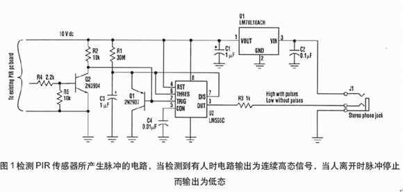 通常,當(dāng)所檢測(cè)區(qū)域無(wú)人時(shí),無(wú)脈沖被檢測(cè),而輸出為低態(tài)。當(dāng)檢測(cè)到脈沖時(shí),輸出變高態(tài)。電源(12~14Vdc)通過(guò)立體聲電話插口(與輸出信號(hào)一道)供電,然后穩(wěn)壓到+10V。此電路放置在PIR傳感器內(nèi),電話插口放在機(jī)盒的下部。電阻器R4連接PIR LED驅(qū)動(dòng)器。地和+10V連接到PIR中的適當(dāng)位置。