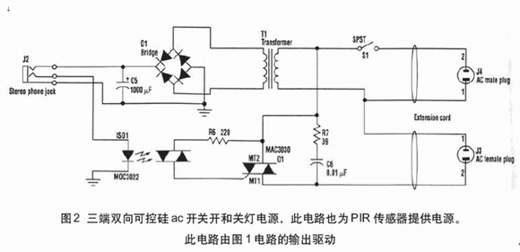 圖2示出三端雙向可控硅控制的ac開(kāi)關(guān),此電路也為PIR供電提供非穩(wěn)壓12~14Vdc。通過(guò)匹配的電話插口由來(lái)自圖1電路的輸出脈沖驅(qū)動(dòng)三端雙向可控硅開(kāi)關(guān)。用標(biāo)準(zhǔn)立體聲音頻纜線連接兩個(gè)電路。