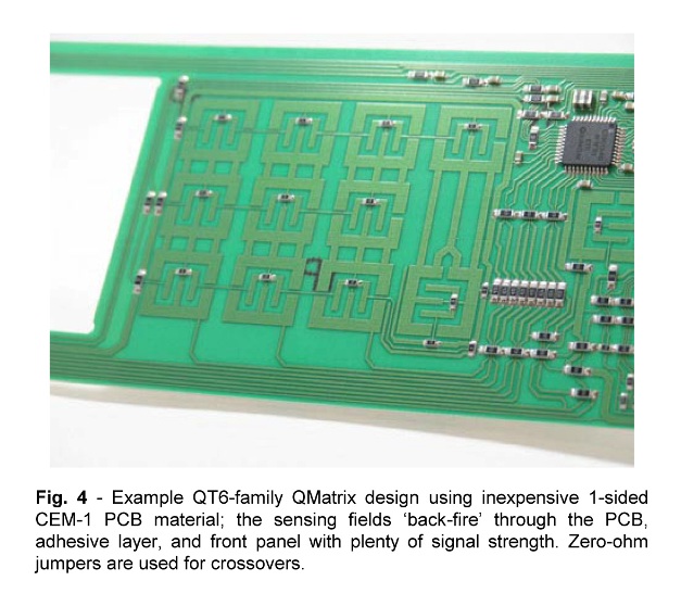 圖4:QT6 系列 QMatrix 設(shè)計(jì)示例。設(shè)計(jì)采用廉價(jià)的單面 CEM-1 PCB 材料,感測(cè)電場(chǎng)背對(duì)穿過(guò) PCB 、膠層和前面板,其信號(hào)強(qiáng)度集中在前面板方向上,使用0 歐姆的跳線器作為交叉。[page]