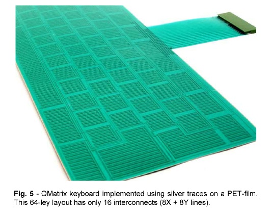 圖5: 利用 PET 薄膜上的銀線來(lái)實(shí)現(xiàn)的 QMatrix 鍵盤,這個(gè) 64 鍵布局只需要 16 個(gè)互聯(lián) (8X + 8Y線)。