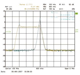 Spread Spectrum Oscillator),來降低系統(tǒng)輻射出來的EMI電磁輻射干擾。圖4則顯示一個(gè)單頻信號(hào)的頻譜圖以及對(duì)該信號(hào)展頻后的頻譜圖。從圖中可知展頻后的頻率信號(hào)如何降低原來在接近100MHz的峰值。