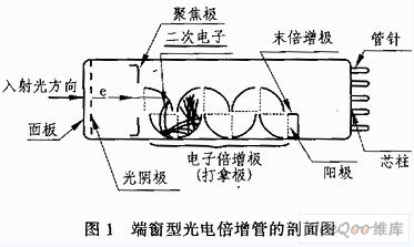 光電倍增管是一種真空器件。它由光電發(fā)射陰極(光陰極)和聚焦電極、電子倍增極及電子收集極(陽極)等組成。典型的光電倍增管按入射光接收方式可分為端窗式和側窗式兩種類型。圖1所示為端窗型光電倍增管的剖面結構圖。其主要工作過程如下: