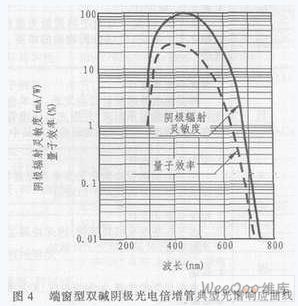 光電倍增管由陰極收入射光子的能量并將其轉換為光子,其轉換效率(陰極靈敏度)隨入射光的波長而變。這種光陰極靈敏度與入射光波長之間的關系叫做光譜響應特性。圖4給出了雙堿光電倍增管(其光陰極材料為Sb-Rb-Cs和Sb-K-Cs)的典型光譜響應曲線。