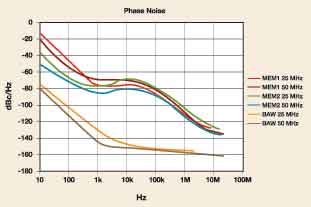 相位噪聲圖很好地展示了這些采用了不同技術(shù)的器件的設(shè)計(jì)與特性。鄰近區(qū)相位噪聲水平(<1kHz)主要取決于Q值或諧振器的選擇,石英BAW諧振器的選擇性遠(yuǎn)高于其他MEMS器件。