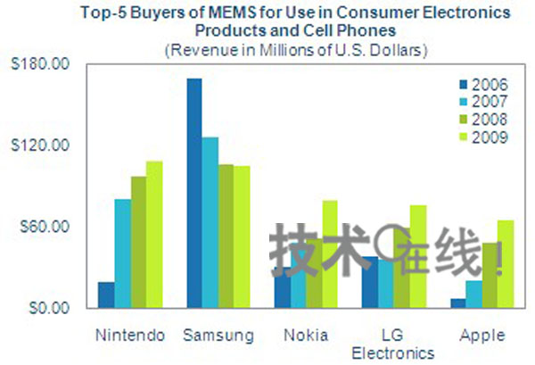 位居第三的諾基亞和位居第四的LG分別是加速度傳感器和BAW濾波器的最大買(mǎi)家。名列第五的蘋(píng)果公司也大量購(gòu)買(mǎi)了加速度傳感器、BAW濾波器和硅麥克風(fēng)。該公司的智能手機(jī)“iPhone”中采用了加速度傳感器和BAW濾波器,筆記本電腦“Mac Book”中采用了加速度傳感器,便攜式音樂(lè)播放器“iPod nano”中采用了加速度傳感器和硅麥克風(fēng)。估計(jì)蘋(píng)果公司預(yù)定在4月上市的平板終端“iPad”也將配備加速度傳感器和硅麥克風(fēng),預(yù)計(jì)該公司的MEMS購(gòu)買(mǎi)額今后仍將擴(kuò)大。