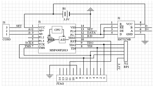本文介紹的單片傳感信號接口設計采用了德州儀器公司新近推出的一款多功能的微控制器MSP430F2013,它內(nèi)部集成了16位的Σ-ΔADC。2kb的程序空間和128b的數(shù)據(jù)存儲空間,可以完成數(shù)據(jù)的智能采集,并采用差分傳輸方式進行數(shù)據(jù)的傳輸。數(shù)據(jù)按幀進行傳輸,傳輸過程中采用CRC檢驗進行差錯控制。
