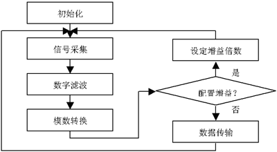 測量時使用內(nèi)部參考電壓,測量信號的電壓輸入范圍為0~500mV,當輸入信號滿量程輸入,模數(shù)轉(zhuǎn)換輸出的最高位不為1時,可進行信號放大,最大放大倍數(shù)可達32。當輸入信號的放大倍數(shù)為N時,輸入信號的范圍會相應地縮小為原來的1/N。例如,當選擇PGA的放大倍數(shù)為2倍時,測量信號的電壓輸入范圍為0~250mV。