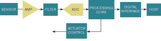 傳感器的模擬信號(hào)必須經(jīng)過(guò)數(shù)字化才能供系統(tǒng)使用,并且信號(hào)要經(jīng)過(guò)放大、濾波和數(shù)字化(圖1)。每一級(jí)通常都涉及一只圍繞著一些無(wú)源元件的器件,以正確地實(shí)現(xiàn)一個(gè)應(yīng)用。一旦對(duì)信號(hào)做了數(shù)字化,就可以將其送給微處理器上的控制系統(tǒng),或整理數(shù)據(jù)后通過(guò)一個(gè)通信協(xié)議送至一只主處理器。協(xié)議可以根據(jù)需要使用傳感器數(shù)據(jù)。