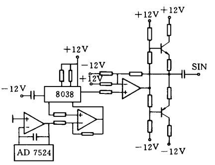 控制器的激勵信號源如圖3 所示。信號由函數(shù)信號發(fā)生器8038 產生,它能夠輸出正弦波和方波,正弦波用作觸摸屏的激勵信號。單片機通過 8 位 D/ A 轉換器可控制8038 的振蕩頻率,一般控制在200 kHz 左右,以避開計算機顯示器掃描信號產生的干擾。同時,由8038 產生的方波信號提供給模擬解調器,作為解調信號參考源。由于8038輸出的正弦波信號功率有限,為此在8038的正弦波信號輸出端增加了功率放大電路。
