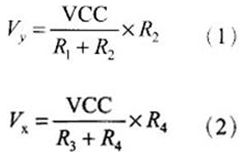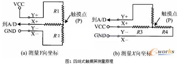觸摸層的兩個金屬導(dǎo)電層分別用來測量X軸和Y軸方向的坐標(biāo)。用于X坐標(biāo)測量的導(dǎo)電層從左右兩端引出兩個電極,記為X+和X-。用于Y坐標(biāo)測量的導(dǎo)電層從上下兩端引出兩個電極,記為Y+和Y-。這就是四線電阻觸摸屏的引線構(gòu)成。當(dāng)在一對電極上施加電壓時,在該導(dǎo)電層上就會形成均勻連接的電壓分布國。若在X方向的電極對上施加一確定的電壓,而Y方向電極對上不加電壓時,在X平行電壓場中,觸點(diǎn)處的電壓值可在在Y+(或Y-)電極上反映出來,通過測量Y+電極對地的電壓大小,便可得知觸點(diǎn)的X坐標(biāo)值。同理,當(dāng)在Y電極對上加電壓,而X電極對上不加電壓時,通過測量X+電極的電壓,便可得知觸點(diǎn)的Y坐標(biāo)。測量原理如圖1所示。