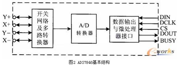 觸摸屏控制器有多種,主要的功能均是在微處理器的控制下向觸摸屏的兩個方向分時施加電壓,并將相應(yīng)的電壓信號傳送給自身A/D轉(zhuǎn)換器,在微處理器SPI口提供的同步時鐘作用下將數(shù)字信號讀入微處理器??刂破鰽DS7846基本結(jié)構(gòu)如圖2所示。