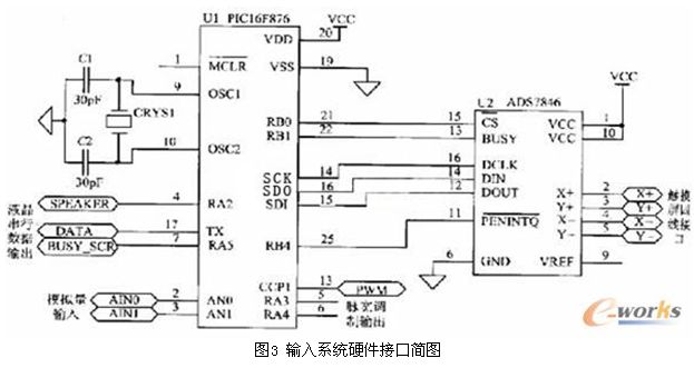 根據(jù)ADS7846與微控制器進(jìn)行數(shù)據(jù)交換的接口特征,選用PIC16F876的SPI口。SPI口包括三個信號:SDO(串行數(shù)據(jù)輸出),SDI(串行數(shù)據(jù)輸入),SCK(串行同步時鐘)。硬件連接關(guān)系見圖3。
