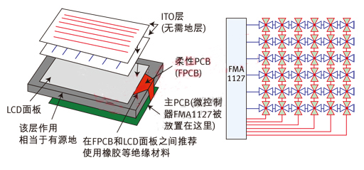 圖5:使用FMA1127實現(xiàn)的觸摸屏及PCB和觸摸屏的疊層安排。利用TDC比較由檢測電容形成RC延時線與基準RC延時線的延時差別。使用差動信號消除或降低了相關/相干噪聲源的影響,無需地層。