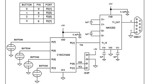 為實(shí)現(xiàn)電容式傳感和串行通信,電路設(shè)計(jì)中采用了賽普拉斯公司的CY8C21x34系列的PSoC芯片,其中包含了一組模擬和數(shù)字功能模塊,它們由存儲(chǔ)在板載閃存中的固件來(lái)設(shè)置。第二個(gè)芯片處理RS232電平移位,以提供與一臺(tái)主機(jī)的通信鏈路,使電容式傳感數(shù)據(jù)記錄通過(guò)串口以115200波特率傳輸給主機(jī)。四個(gè)電容傳感按鍵的引腳分配顯示在圖5中的表中。通過(guò)ISSP接口和編程引腳SCL、SDA對(duì)PSoC進(jìn)行編程。ISSP接口中包含電源和地,而PC主機(jī)連接到電容式傳感電路板通過(guò)標(biāo)準(zhǔn)的DB9連接器。