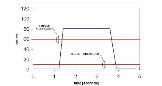 同時(shí)還給出了門限值。噪聲門限被設(shè)定的計(jì)數(shù)值為10,而手指門限設(shè)定的計(jì)數(shù)值則為60。實(shí)際上,在實(shí)際計(jì)數(shù)數(shù)據(jù)中始終存在噪聲分量,圖中并未顯示,以便能清晰地顯示門限水平。