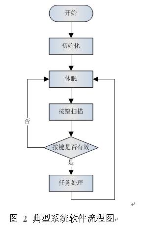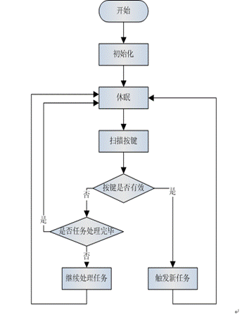 圖2是一個具有休眠功能的典型系統(tǒng)軟件流程圖。系統(tǒng)初始化后進入休眠模式,經(jīng)過一段時間的延時后喚醒掃描按鍵模塊,進行按鍵掃描。如果有按鍵按下,軟件判斷是否有效。如果無效按鍵按下,那么系統(tǒng)繼續(xù)進入休眠模式。如果軟件判斷按鍵有效,那么喚醒系統(tǒng),觸發(fā)任務(wù)處理進程。當處理完所有任務(wù)后,系統(tǒng)又重新進入休眠狀態(tài)。這是個典型的具有休眠功能的系統(tǒng)工作流程圖,它的優(yōu)點就是此軟件流程簡單易懂、容易實現(xiàn),一般可以滿足大多數(shù)場合的應(yīng)用。但是,如果系統(tǒng)任務(wù)處理消耗了較多的CPU處理時間,那么為了達到目標平均工作電流,就需要相應(yīng)增加休眠時間。同時降低了按鍵掃描的頻率,從而加長了系統(tǒng)喚醒的響應(yīng)時間。因此,此方法適合比較簡單的、系統(tǒng)任務(wù)不復雜的應(yīng)用。