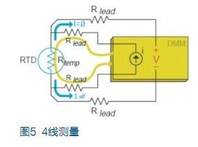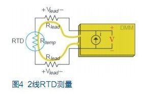 與熱敏電阻相似,鉑電阻溫度傳感器(RTD)也是用鉑制成的熱敏感電阻。當(dāng)通過測量電壓計(jì)算RTD 溫度時(shí),數(shù)字萬用表用已知電流源測量該電流源所產(chǎn)生的電壓。這一電壓為兩條引線(Vlead)上的壓降加RTD上的電壓(Vtemp)。例如,常用RTD 的電阻為100Ω,每1℃僅產(chǎn)生0.385Ω的電阻變化。如果每條引線有10Ω電阻,就將造成26℃的測量誤差,這是不可接受的。所以應(yīng)對(duì)RTD作4線歐姆測量。