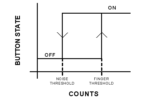 該轉(zhuǎn)移函數(shù)中的延滯帶來了開關(guān)狀態(tài)之間的快速轉(zhuǎn)換,即使計數(shù)是有噪聲的情況下也不例外。同時這還給按鍵帶來了一種反跳功能。低門限被稱為“噪聲門限”,而高門限則被稱為“手指門限”。門限水平的設(shè)定決定了系統(tǒng)的性能。當(dāng)覆蓋層非常厚時,信噪比很低。在此類系統(tǒng)中設(shè)定門限水平是一項具有挑戰(zhàn)性的工作,而這恰好是電容式傳感設(shè)計技巧的一部分。