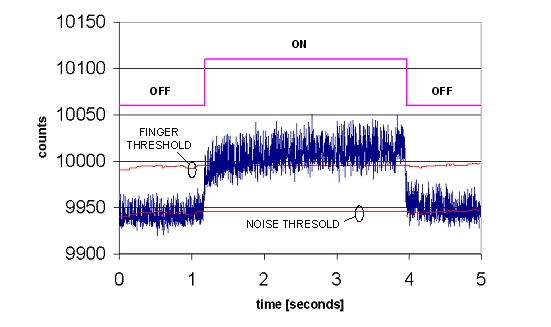 噪聲門限被設(shè)定的計數(shù)值為10,而手指門限設(shè)定的計數(shù)值則為60。實際上,在實際計數(shù)數(shù)據(jù)中噪聲分量是始終存在,圖中沒有顯示是為了能清晰地顯示門限水平。
