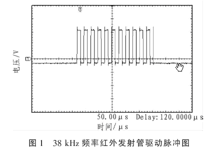 發(fā)射管選取SIR204-A型發(fā)射管,該紅外線二極管驅(qū)動(dòng)電流范嗣為20~100 mA,其正向?qū)▔航禐?.3~1.5 V,發(fā)出紅外線光波長(zhǎng)范圍約為835~930 nm,發(fā)射角度為30°,直射時(shí)紅外線光強(qiáng)度最大。發(fā)射管驅(qū)動(dòng)電壓采用脈沖電壓,38 kHz載波頻率,發(fā)送時(shí)長(zhǎng)為280 μs,占空比為1/2的方波,發(fā)送間隔為720 μs。載波脈沖需要與紅外線接收管的型號(hào)相匹配。紅外發(fā)射管能夠匹配光電晶體管、光敏二極管和紅外接收器模塊,紅外傳感器的接收部分選擇了帶有放大和濾波功能的紅外線接收二極管。發(fā)射部分的設(shè)計(jì)需要考慮到接收部分的制約。經(jīng)過驗(yàn)證調(diào)制脈沖驅(qū)動(dòng)電流能夠匹配紅外線接收管,將紅外線接收管導(dǎo)通。驅(qū)動(dòng)發(fā)射管PWM的波形如圖1所示。