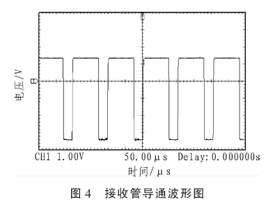 紅外線接收管選用HS0038型的紅外一體接收頭,該器件集成度高,能夠以小成本實(shí)現(xiàn)圖3所示功能。紅外線接收管需要接收38 kHz左右?guī)挼拿}沖波形,接收發(fā)射管只能接收間歇發(fā)射的紅外線,發(fā)射紅外線過于密集,接收管無法導(dǎo)通,需要予以注意。紅外線發(fā)射管發(fā)出38 kHz載波,將紅外線接收管導(dǎo)通。該波形頻率為1 kHz,周期內(nèi)高電平時(shí)間720μs,低電平時(shí)間280μs。當(dāng)有物體遮擋紅外線對(duì)射管時(shí),發(fā)射源被遮擋,紅外線接收管無法導(dǎo)通,輸出高電平。由此可以判斷是否有物體從紅外線對(duì)射管中間通過。紅外線接收管導(dǎo)通時(shí)的輸出波形如圖4所示。