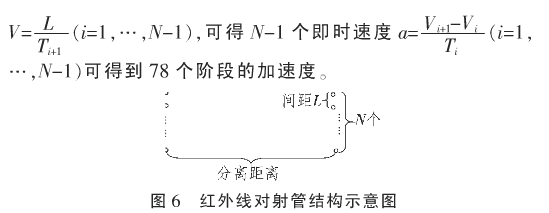 紅外線對(duì)射管構(gòu)成一對(duì)紅外傳感器收發(fā)子單元。若干對(duì)紅外傳感器收發(fā)子單元構(gòu)成完整的紅外線測(cè)速傳感器,其紅外線對(duì)射管分離距離和紅外傳感器收發(fā)子單元間距可以調(diào)整。如圖6所示,Ⅳ需要大于2,分離距離超過5 m。在兩對(duì)紅外線對(duì)射管之間測(cè)量物體經(jīng)過的時(shí)間T,間距設(shè)置為L(zhǎng),可以得到后一對(duì)紅外線對(duì)射管的即時(shí)速度V: