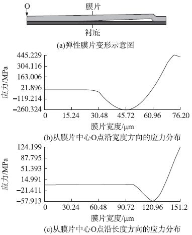 本文以量程0.1 MPa 的犧牲層結(jié)構(gòu)壓力傳感器為例,設(shè)計(jì)出電壓源E =5 V 時(shí),滿量程輸出為60 mV的壓力芯片。為了滿足靈敏度的設(shè)計(jì)要求,改變彈性膜片的寬度、長(zhǎng)度、厚度和犧牲層厚度對(duì)應(yīng)力分布進(jìn)行模擬仿真( 模擬仿真時(shí)多晶硅楊氏模量EX = 1.7 ×1011 N/m2,泊松比PRXY =0.24,多晶硅納米薄膜應(yīng)變因子G =30) ,經(jīng)過(guò)優(yōu)化后,得到滿足設(shè)計(jì)要求的彈性膜片尺寸: 長(zhǎng)度a = 300 μm、寬度b = 150 μm、膜片厚度H1 =3 μm、犧牲層厚度H2 =3.5 μm。