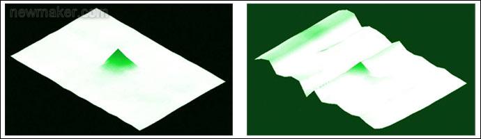 圖4. 4英寸屏上使用2mm導電書寫筆的電容值剖面圖,左側(cè)剖面使用高SNR觸摸屏控制器;右側(cè)使用低SNR觸摸屏控制器。書寫筆位于綠色錐體頂部;白色平面的 高度代表了背景噪聲。信噪比的增加有效降低了背景噪聲幅度,如左圖所示。如果右圖中的書寫筆移到屏幕的左邊,信號將被噪聲淹沒,書寫筆將無法工作。