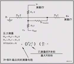 四線和八線觸摸屏可以測(cè)量出接觸電阻,即圖5中的RTOUCH。RTOUCH與觸摸壓力近似成正比。要測(cè)量觸摸壓力,需要知道觸摸屏中一層或兩層的電阻。圖6中的公式給出了計(jì)算方法。需要注意的是,如果Z1的測(cè)量值接近或等于0(在測(cè)量過程中當(dāng)觸摸點(diǎn)靠近接地的X總線時(shí)),計(jì)算將出現(xiàn)一些問題,通過采用弱上拉方法可以有效改善這個(gè)問題。