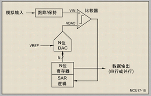 該結(jié)構(gòu)將模擬輸入電壓(VIN)保存在一個(gè)跟蹤/保持器中,N位寄存器被設(shè)置為中間值(即100.。.0,其中最高位被設(shè)置為1),以執(zhí)行二進(jìn)制查找算法。因此,數(shù)模轉(zhuǎn)換器(DAC)的輸出(VDAC)為VREF的二分之一,這里VREF為ADC的參考電壓。之后,再執(zhí)行一個(gè)比較操作,以決定VIN小于還是大于VDAC: