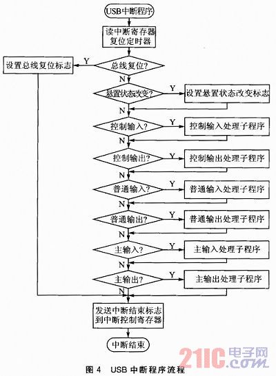 因為C8051F321的USB模塊高度集成化,所以對USB接口的設(shè)計主要是USB固件程序的設(shè)計。其中最重要的是USB描述符和USB傳輸中斷的處理。當(dāng)USB中斷到達時,C8051F321首先讀取3個中斷寄存器(CMINT、IN1INT和OUT1INT)來判斷中斷來源(USB復(fù)位中斷、端點0中斷、端點1輸入中斷、端點2輸出中斷),然后跳入相應(yīng)的處理模塊進行處理。USB中斷程序流程如圖4所示。