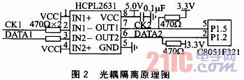 由于系統(tǒng)經(jīng)常工作在工業(yè)現(xiàn)場等領(lǐng)域,各種電磁干擾很常見,為了使系統(tǒng)能穩(wěn)定工作,采用光耦隔離技術(shù)將傳感器和單片機隔離。光耦隔離原理圖如圖2所示。光耦器件采用HCPL2631高速光耦,輸出引腳OUT1和OUT2經(jīng)過上拉電阻處理后,將CK2和DATA2信號傳輸給C8051F321單片機處理。