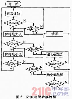 附加功能子程序包括正常計數(shù)、數(shù)據(jù)保持、最大值跟蹤、最小值跟蹤和清零的功能。對附加功能的實現(xiàn)均是通過控制CK和DATA信號線完成,附加功能轉(zhuǎn)換流程如圖5所示。給CK信號線一個負(fù)脈沖,即可完成清零操作;在正常計數(shù)狀態(tài)下將DATA信號線置為高電平,容柵傳感器將進入保數(shù)功能;如果再將CK信號線置為低電平,容柵傳感器進入最大值跟蹤功能;內(nèi)部專用芯片將用新測得的數(shù)據(jù)與上一個數(shù)據(jù)進行比較,如果新測得數(shù)據(jù)大,則替換掉,否則丟棄??梢栽谏衔粰C上通過USB測試軟件發(fā)送相關(guān)命令來控制系統(tǒng)進行操作。程序中設(shè)定一個字節(jié)的變量來存放從上位機接收到的命令,當(dāng)判斷是其中的一個命令時就調(diào)用相應(yīng)的處理程序完成操作。