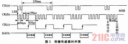 容柵傳感器接口為B531,信號線有4根:電源線(1.5 V)、地線(0 V)、時鐘線(CK)、串行數(shù)據(jù)線(DATA),并且通過控制CK、DATA信號線的電平可以實現(xiàn)容柵傳感器的不同功能比,如最大值跟蹤、最小值跟蹤、數(shù)據(jù)保持和清零等。