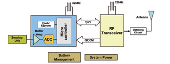 每個無線傳感器都被看作一個節(jié)點(diǎn),擁有無線通信能力,同時還具有一定的信號處理與網(wǎng)絡(luò)數(shù)據(jù)的智能。根據(jù)應(yīng)用的類型,每個節(jié)點(diǎn)都可以有一個指定的地址。圖2顯示了某個節(jié)點(diǎn)的通用結(jié)構(gòu)圖。它一般會包括一個傳感裝置、一個數(shù)據(jù)處理微控制器,以及一個無線連接RF模塊。根據(jù)不同的網(wǎng)絡(luò)定義,RF模塊可以起到一個簡單發(fā)射器或者收發(fā)器 (TX/RX)的作用。進(jìn)行節(jié)點(diǎn)設(shè)計時,注意電流消耗和處理能力非常的重要。微控制器的內(nèi)存非常依賴于所使用的軟件棧。