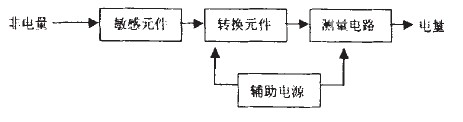 傳感器是將各種非電量(包括物理量、化學(xué)量、生物量等)按一定規(guī)律轉(zhuǎn)換成便于處理和傳輸?shù)牧硪环N物理量 (一般為電量)的裝置。傳感器一般由敏感元件、轉(zhuǎn)換元件和測量電路三部分組成,有時還需外加輔助電源。 傳感器方框圖如圖1所示。
