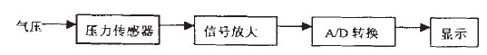 下面以測量輪胎氣壓為例詳細(xì)闡述氣壓傳感器在汽車輪胎方面的應(yīng)用。此種設(shè)計可做成一種便攜式的裝置,測量時將氣壓傳感器的表置于輪胎氣門嘴上,這時胎壓作用于傳感器的膜片上, 通過壓阻效應(yīng)和系列變換輸出微弱的電壓信號,將電壓信號進行相應(yīng)處理顯示電壓值。由此可知不同的氣壓對應(yīng)著不同的電壓值,即氣壓值和電壓值是一一對應(yīng)的,從而間接測量了氣壓值。胎壓測量電路方框圖如圖4所示。