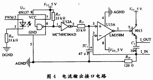 數(shù)據(jù)處理單元具備一路可控4~20 mA的電流輸出,用于現(xiàn)場指示儀表的驅(qū)動。具體的連接電路如圖4所示。其中PWM2連接ARM的PWM2引腳,PWM信號用于控制光耦的導(dǎo)通與截止,反相器主要用于波形的整定,根據(jù)磁敏角度和位移關(guān)系,建立數(shù)學(xué)模型,計算出PWM的占空比,從而達(dá)到電流大小調(diào)節(jié)的目的。
