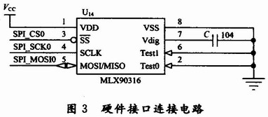 由于串行通信的輸出信號直接來自于MLX90316的內(nèi)部DSP輸出,SPI輸出模式更穩(wěn)定,誤差更小,并且具有更高的抗干擾能力。在本設(shè)計中,選用SPI接口,具體的硬件接口連接電路如圖3所示。在圖3中,MLX90316的SPI三根線與ARM LPC2136的SPl0口連接。SPI(SerialProtocol InterIace)總線接口是一種同步串行外設(shè)接口。這是一個4根信號線的串行接口協(xié)議,包括主、從兩種模式。這4根信號線分別是:時鐘線(SCK)、數(shù)據(jù)輸入線(MISO)、數(shù)據(jù)輸出線(MOSI)和從設(shè)備使能線(SS)。