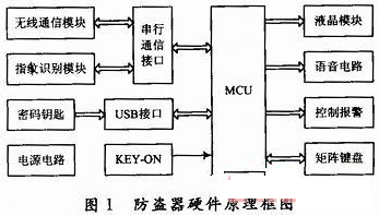 主要工作原理如下:車主停車熄火后,防盜器進入鎖定狀態(tài)。此時如果汽車鑰匙不在ON位,就不能進行指紋識別;只有當(dāng)汽車鑰匙在ON位,才可用指紋識別解鎖防盜器并自動點火。在鎖定狀態(tài)下,汽車的油路、電路等被切斷,汽車鑰匙無法點火;如果強行剪斷指紋采集模塊和控制盒的連線,或者不識別指紋而強行用汽車鑰匙點火,汽車會通過鳴號、閃燈和無線通信網(wǎng)絡(luò)報警。在鎖定狀態(tài)插入密碼鑰匙可進入解鎖狀態(tài),并可根據(jù)LCD和語音提示通過小鍵盤進行指紋注冊/刪除、手機號碼設(shè)置和應(yīng)急點火等操作。