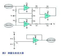 正如上述所說(shuō),ECG的信號(hào)路徑必須能調(diào)理不同來(lái)源的噪聲。對(duì)抗直流電噪聲,可以使用高通濾波器。然而,最令人頭痛的是50Hz的噪聲,因?yàn)樗鼊偤门c我們收集的信號(hào)頻率處于相同范圍。要消除這個(gè)共模噪聲,需要建立一個(gè)測(cè)量?jī)x表放大器。這個(gè)配置之所以很理想是因?yàn)樗稍谝种乒材k妷旱耐瑫r(shí)放大有用的差分信號(hào),這利于把微弱的有效信號(hào)從背景噪聲中分隔出來(lái)。正如圖2所示,這個(gè)儀表放大器是用LMP2234(四通道、微功率、高精度的RRO運(yùn)算放大器)和高精度的電阻器(0.1%)實(shí)現(xiàn)出來(lái)。