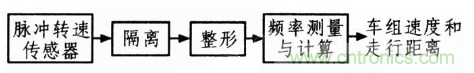 從上式可知,測(cè)量列車(chē)速度就是檢測(cè)列車(chē)車(chē)輪轉(zhuǎn)速和列車(chē)輪徑。脈沖轉(zhuǎn)速傳感器安裝在輪軸上,輪軸每轉(zhuǎn)動(dòng)一周,傳感器輸出一定數(shù)目的脈沖,使脈沖頻率與輪軸轉(zhuǎn)速成正比。輸出的脈沖經(jīng)隔離和整形后直接輸入計(jì)算機(jī)CPU進(jìn)行頻率測(cè)量,再經(jīng)換算從而得出車(chē)組速度和走行距離閉。其原理框圖如圖1所示。