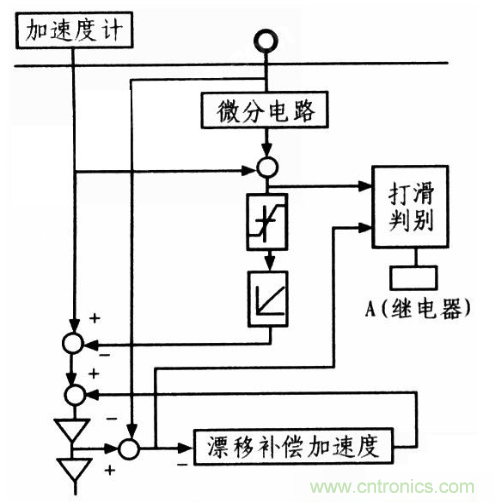 輪軸脈沖轉(zhuǎn)速傳感器也存在一定缺陷:即車(chē)輪空轉(zhuǎn)或打滑會(huì)使列車(chē)速度的測(cè)量結(jié)果存在誤差,為解決此類(lèi)問(wèn)題,在列車(chē)車(chē)軸上加裝一個(gè)加速度傳感器,配合脈沖轉(zhuǎn)速傳感器使用。該方式工作原理:在列車(chē)打滑期間,把機(jī)車(chē)的內(nèi)加速度作為測(cè)速的信息源,該信息與車(chē)輪旋轉(zhuǎn)的狀態(tài)等信息不相關(guān),而在其余工作時(shí)間仍用輪軸脈沖傳感器測(cè)速,所以該方式稱(chēng)為基于慣性加速度傳感器的測(cè)速。在車(chē)輪打滑時(shí),由加速度傳感器測(cè)得加速度及車(chē)輪打滑前加速度的傾斜分量,而計(jì)算出車(chē)輪打滑時(shí)的列車(chē)運(yùn)行加速度,再將該值積分即得車(chē)輪打滑時(shí)列車(chē)實(shí)時(shí)運(yùn)行的速度。具體原理如圖2所示。