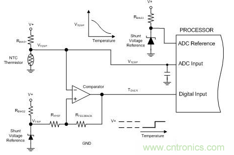 處理器的模數(shù)轉(zhuǎn)換器用于采集溫度模擬電壓(VTEMP)。當(dāng)溫度超出臨界值時(shí),過熱(TOVER)輸出端會(huì)驅(qū)動(dòng)處理器的輸入端進(jìn)行指示。跳脫點(diǎn)由兩個(gè)無源電阻器(RSENSE1和RSENSE2)設(shè)置,而不是由有效參考端和偏壓電阻器設(shè)置。