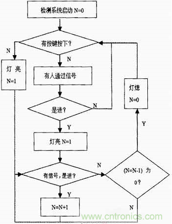 系統(tǒng)流程圖如圖5所示。其中N表示洗手間內(nèi)現(xiàn)有的人數(shù),當(dāng)檢測系統(tǒng)電源連上后,光電傳感器開始檢測,但系統(tǒng)不知道洗手間內(nèi)此時是否有人,默認是無人,因而燈是不會亮的,這時按鍵可以用來對系統(tǒng)進行調(diào)整。當(dāng)光強增大到一定值時,檢測系統(tǒng)自動停止工作。