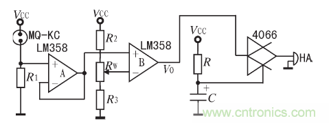 圖1所示的基本報警電路的不足:一開始加電時,傳感器尚未達到穩(wěn)態(tài),其電阻值較小,VR1較大,導(dǎo)致蜂鳴器HA誤報警。為了解決這一問題,采用一個數(shù)字信號控制的模擬開關(guān),其控制信號采用簡單的電容充電延時電路,原理圖如圖2所示。圖1中比較器B的輸出V0加到模擬開關(guān)4066的輸入端,開關(guān)的輸出端接蜂鳴器HA。初始加電時,電容C上的電壓VC為0,4066不導(dǎo)通,無論V0值為多高,HA都不會報警。隨著電容充電,VC不斷升高,當(dāng)達到4066的控制門限閾值時,4066才導(dǎo)通,即能進入報警狀態(tài)。電容充電使其電壓達到4066的控制門限閾值時間即為延時時間。電容C和電阻R的取值可根據(jù)延時要求確定。為可靠起見,取RC=1/2T,T為傳感器初始穩(wěn)定時間。本裝置取R=l MΩ,C=100μF,即能實現(xiàn)可靠的延時。