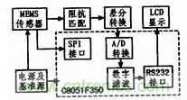 設(shè)計中采用C8051F350的24位Sigma-Delta模/數(shù)轉(zhuǎn)換器作系統(tǒng)信號的模數(shù)轉(zhuǎn)換,SPI接口作MEMS傾角傳感器的溫度采集,以實現(xiàn)對傳感器的溫度補償,UART作串行LED顯示接口。為保證模/數(shù)轉(zhuǎn)換器工作穩(wěn)定,采用外部基準(zhǔn)源。