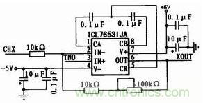 信號放大電路采用ICL7653斬波穩(wěn)零運算放大器來 完成,如圖2所示。ICL7653具有極低的失調(diào)電壓和偏置電流,具有較高的工作穩(wěn)定性和優(yōu)良的高精度放大功能。ICL7653斬波穩(wěn)零使用內(nèi)部時鐘時, 在CA、CB與CR端之間加上0.1 μF的低泄放、高穩(wěn)定性的聚酯或聚丙烯電容。同時在雙電源接入端進行濾波和去耦處理。