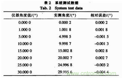 從表2的測試數(shù)據(jù)可知,每個測試點的偏差有正有負(fù),其主要原因在于這些測試點的曲線擬合是獨立的,互不影響。另外,在30°時絕對誤差最大,最大的絕對誤差為0.0044°,在1°時相對誤差最大,為0.001 8/1≈0.018%。